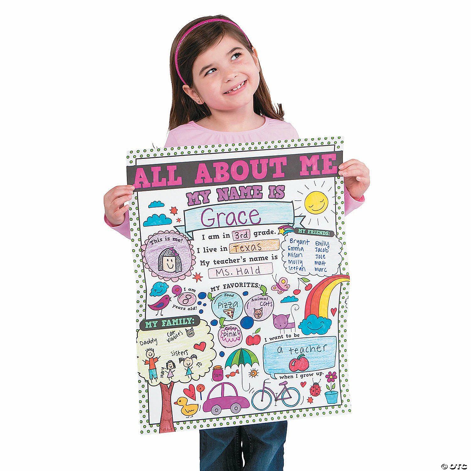 From favorite foods to future career aspirations, students can share all about themselves with this fun activity! A great addition to kidsβ crafts, these posters are designed with dandy doodles of cats, clouds and so much more – making for an engaging and exciting coloring project. This is a great way for children to journal and get to know themselves as well as their classmates better! Paper. (30 pcs. per unit) 17″ x 22″ © OTC