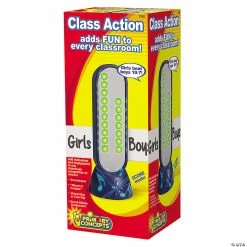 Class Action’s five intuitive modes have endless applications, is for all ages and brings new engagement and motivation to the classroom. You and your students will think up countless new ways to use it every day! One year unconditional warranty. Uses 3 “C” batteries. (Battery life in typical classroom operation is 6 months – 2 years, but varies according to usage.) SCORE: Keeps score for two teams or players. Just press the button to award points and rewards winners with a dazzling sound and light show! DICE: Just press the button to “roll the dice” and determine how many points the question is worth, who goes first, you name it! SPIN: Flashing lights chase rapidly round and round “wheel of fortune” style, then slower and s-l-o–w—e—-r until they finally stop on the chosen one! FLIP: A virtual coin flip at the touch of a button… Great probability and chance demonstration too!
