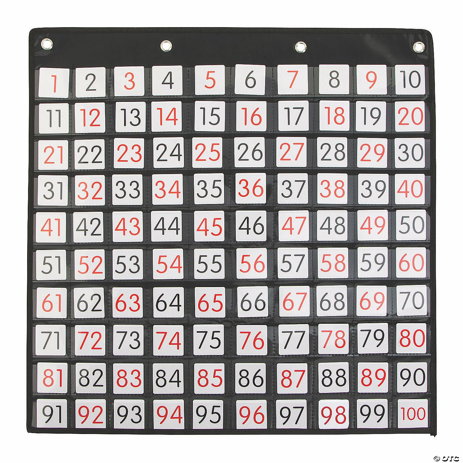 Reinforce number skills and teach kids to count to 100 with ease! Perfect for classroom dΓ©cor that enhances math curriculum, this ready-to-use chart includes 100 number cards that can be easily placed in the individual pockets. Even better, each card is double-sided in two colors, so these can be used to introduce odd and even numbers, skip counting and more. Polyester. (101 pcs. per unit) Chart, 26″ x 26″; paper cards, 2″. Includes grommets for hanging. Β© OTC