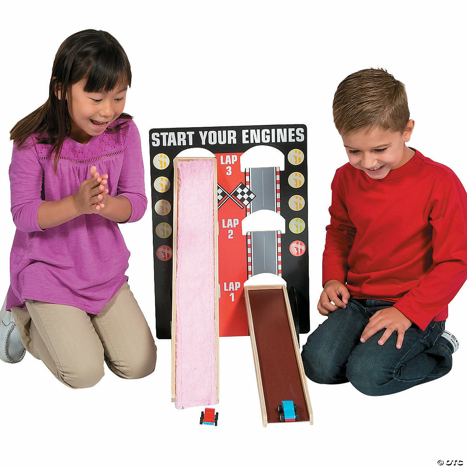 This fun STEM activity is a hands-on way for students to learn and understand the concepts of motion and friction. Featuring three different heights and various materials and fabrics, this activity is designed for students to test and observe how different materials and fabrics affect the speed of cars. Engineered for learning fun, this is a durable, interactive activity that is easy to incorporate into existing curriculum. Each strip has velcro that adheres directly onto the wooden ramp. Includes 8 strips of different materials and 6 plain strips for decorating with your own materials. Wood. (21 pcs. per unit) Board, 14 3/4″ x 20 1/4″; ramps, 3 3/4″ x 26″. © OTC